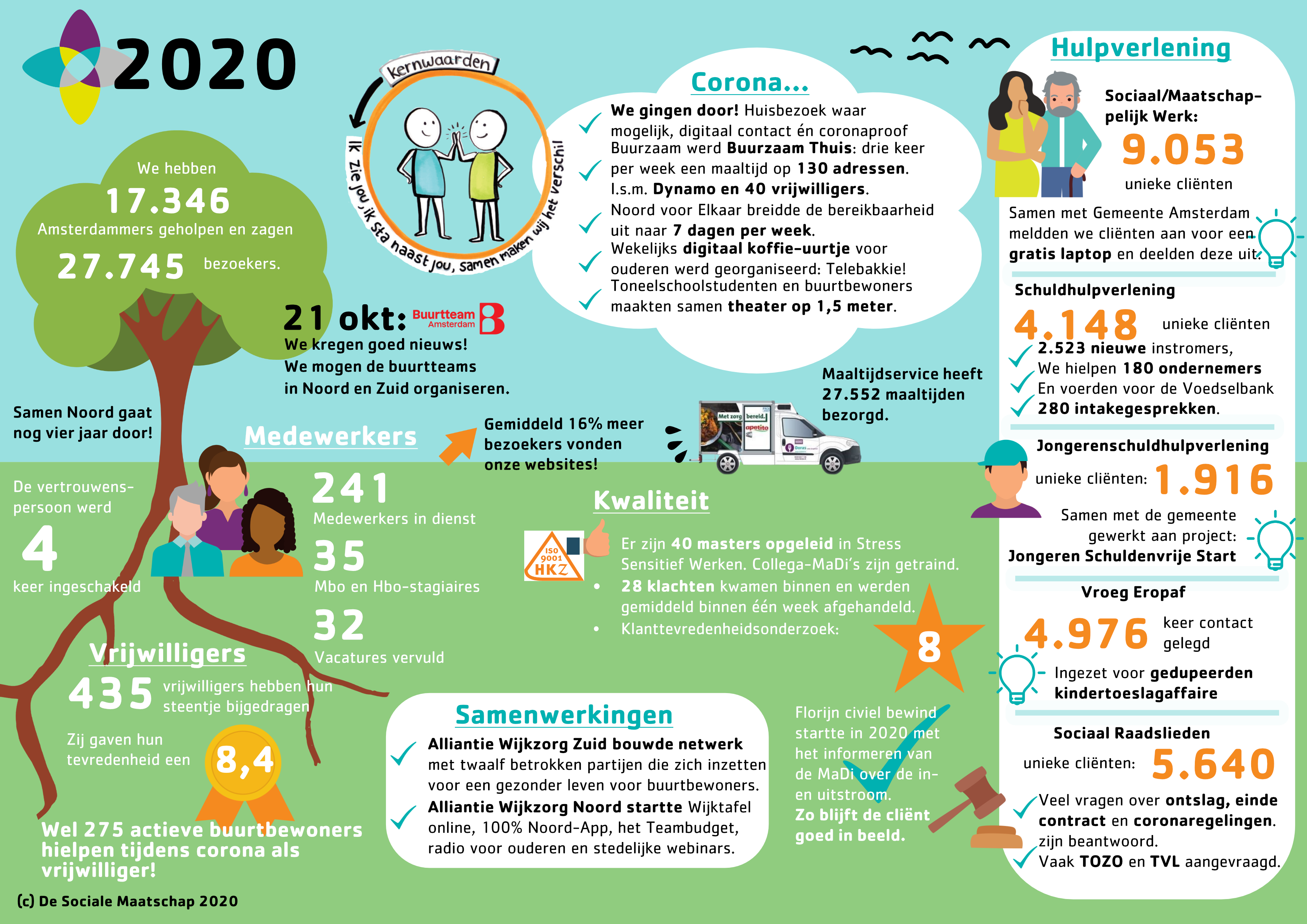 Hoeveel Amsterdammers hebben wij het afgelopen jaar geholpen? Wat voor cijfer krijgt de klanttevredenheid? En wat zijn de trends en ontwikkelingen? Dat – en daarnaast mooie verhalen en beelden van onze dienstverlening – vind je in het Jaarverslag De Sociale Maatschap 2020.